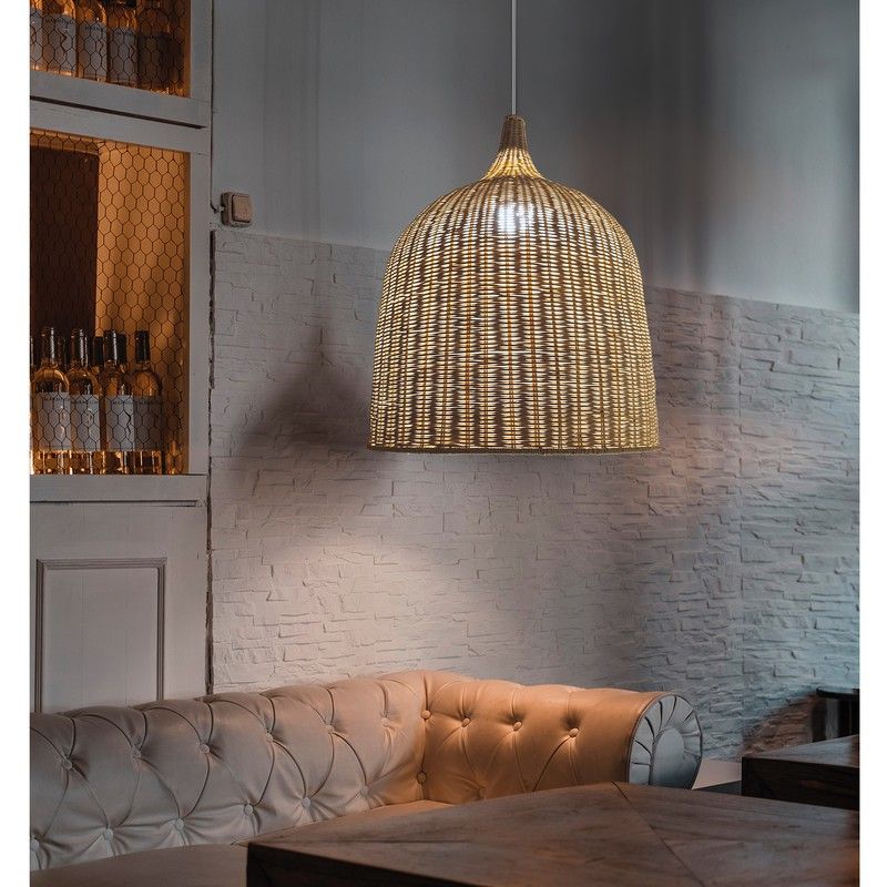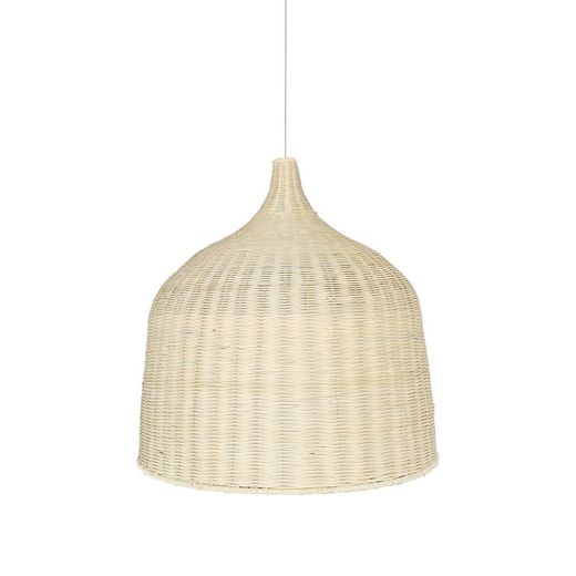 Lámpara colgante BORA BORA fabricada en ratán ,florón blanco metálico cable en PVC blanco portalámparas E-27 IP20 .Pantalla de grandes dimensiones 600mm. de diámetro por 650mm. de alto.