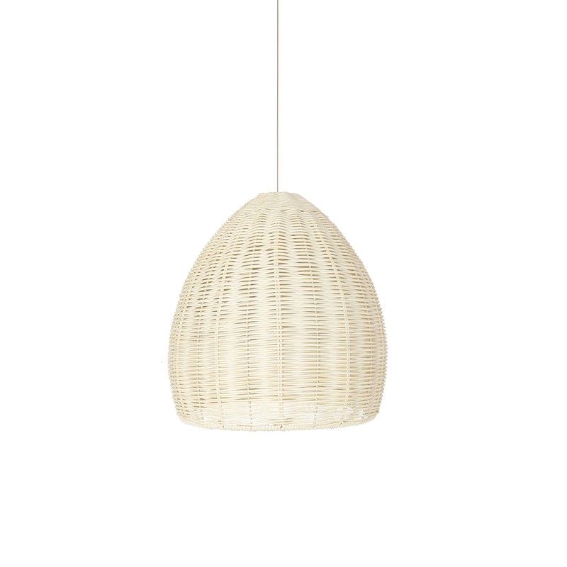 Lámpara colgante JAVA fabricada a mano en ratán blanco . Florón metálico blanco cable de PVC blanco con 1460mm.de largo y portalámparas E-27 con IP 20.