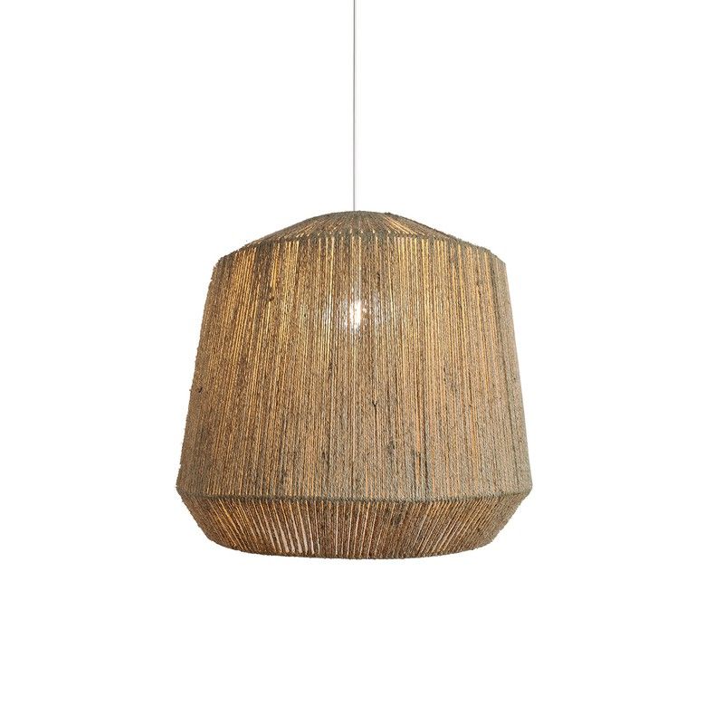 Lámpara colgante MANILA fabricada artesanalmente en yute tostado . Florón metálico blanco ,cable en PVC blanco de 1400 mm y portalámparas E-27.