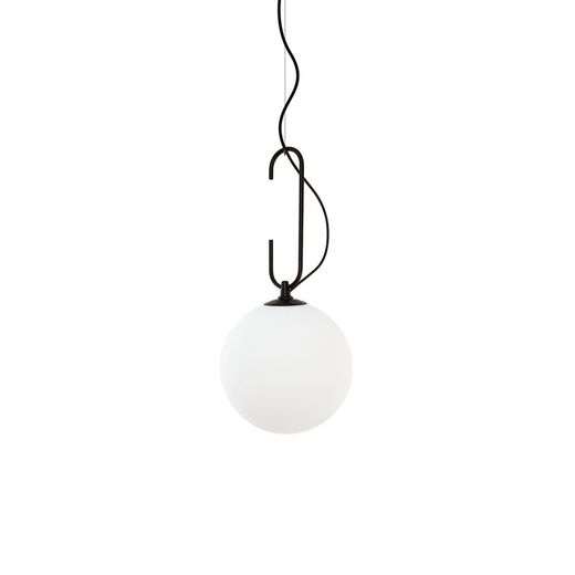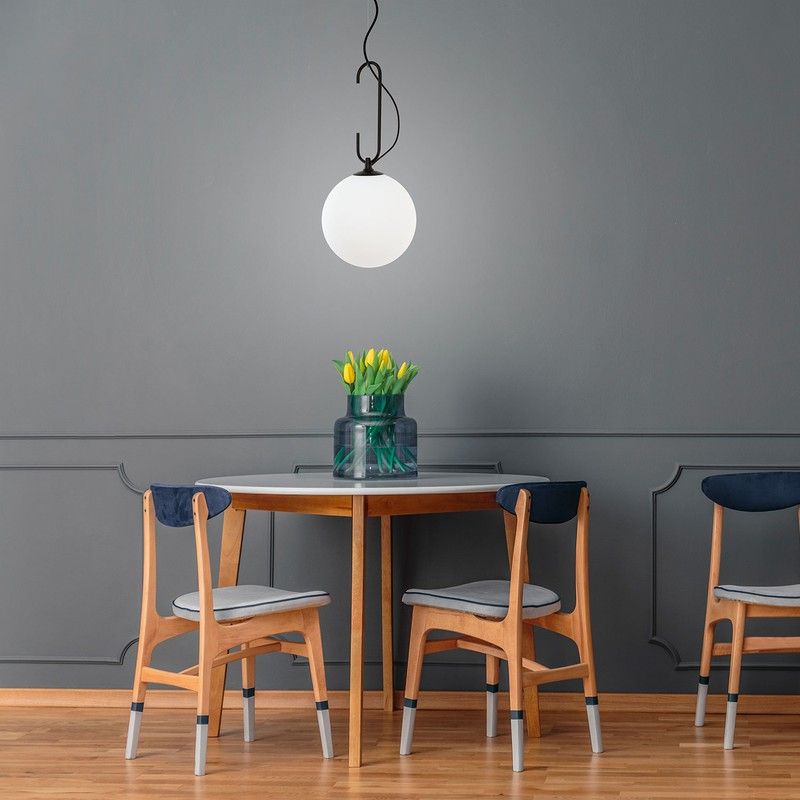 Lámpara colgante MD2413-BK fabricada en metal negro mate , cristal opal mate de 30cm. de diámetro , cable en PVC negro de 1,5 m. de largo . Portalámparas E-27 .