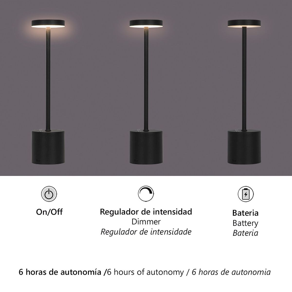 Interruptor táctil On/Off en la base.Intensidad de la luz regulable.Lámpara recargable.Bateria: 6 horas de autonomia.Diámetro 8 cm. / Altura 34 cm.Cable 50cms, entrada USB tipo C.
