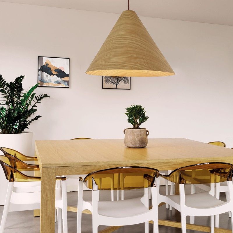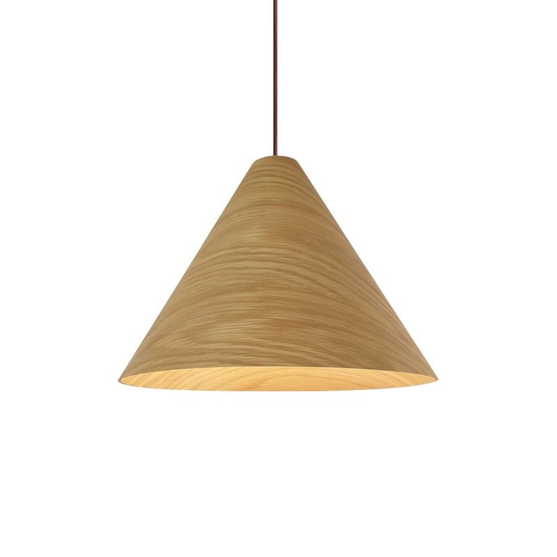 Lámpara colgante TESSA fabricada en madera de color natural.Florón de madera y cable textil marrón de 1,3cm. de largo.Campana de 61 cm. de diámetro . Portalámparas E-27 .